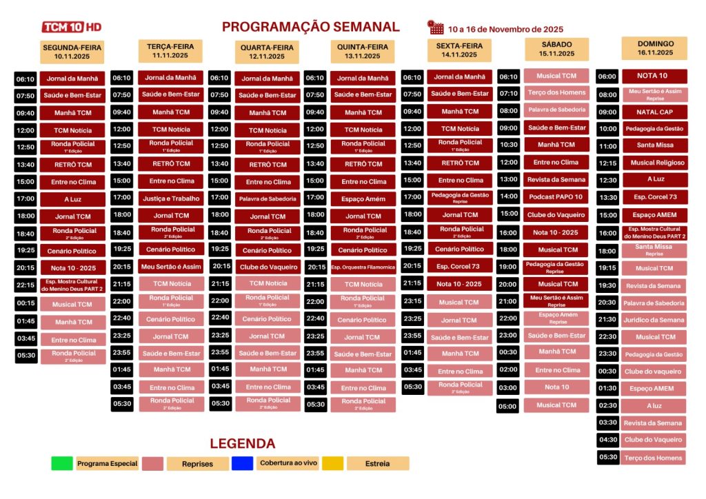 O Canal TCM 10 HD, da TCM Telecom, anunciou sua grade de programação para o período de 10 a 16 de novembro de 2025. A programação poderá ser acompanhada pelos assinantes TCM através dos canais 10 ou 14.1.