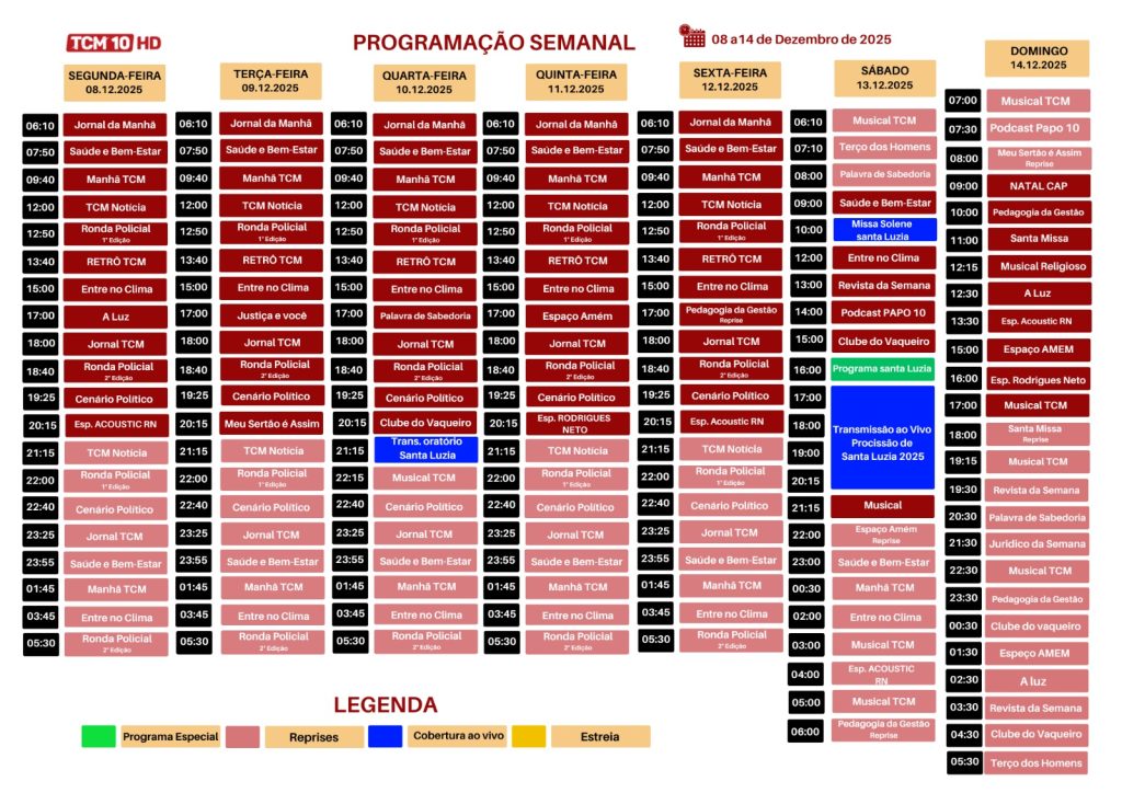 O Canal TCM 10 HD, da TCM Telecom, anunciou sua grade de programação para o período de 8 a 14 de dezembro de 2025. A programação poderá ser acompanhada pelos assinantes TCM através dos canais 10 ou 14.1. Quem ainda não é assinante pode conferir o conteúdo pelo site www.tcmplay.tv.br.