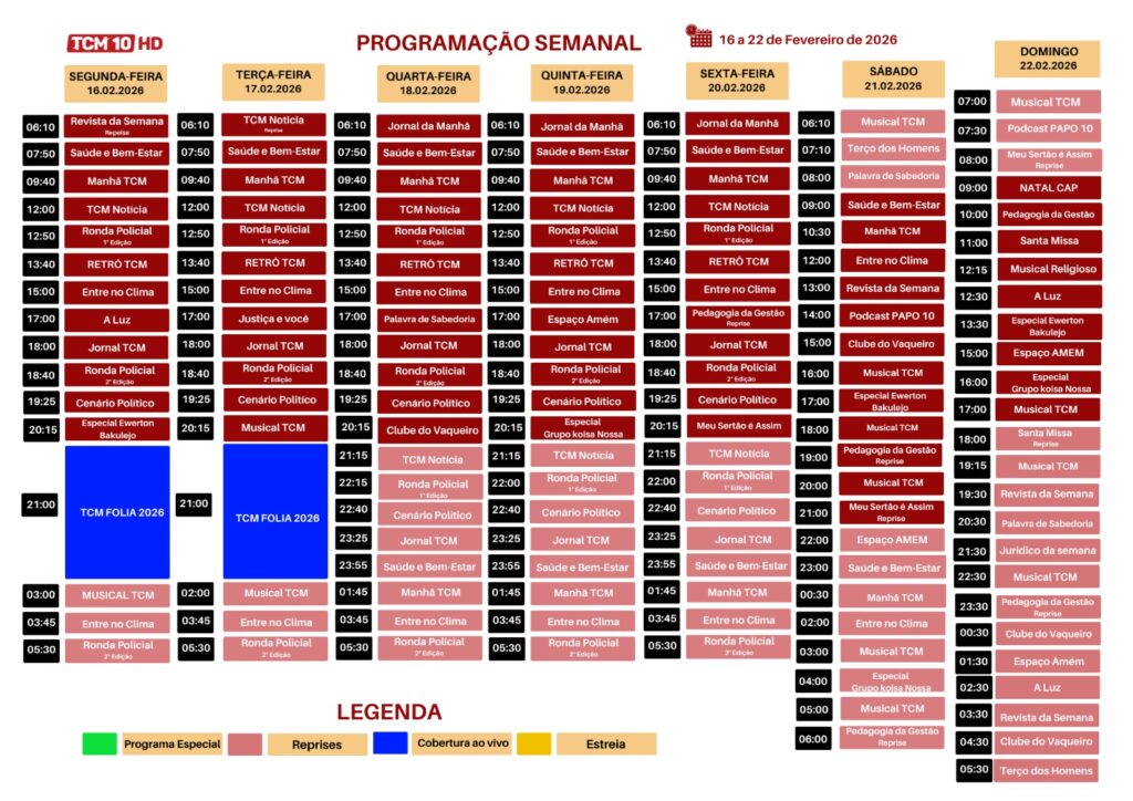 O Canal TCM 10 HD, da TCM Telecom, anunciou a grade de programação para o período de 16 a 22 de fevereiro de 2026. A programação poderá ser acompanhada pelos assinantes TCM através dos canais 10 ou 14.1. Quem ainda não é assinante pode conferir o conteúdo pelo site www.tcmplay.tv.br.