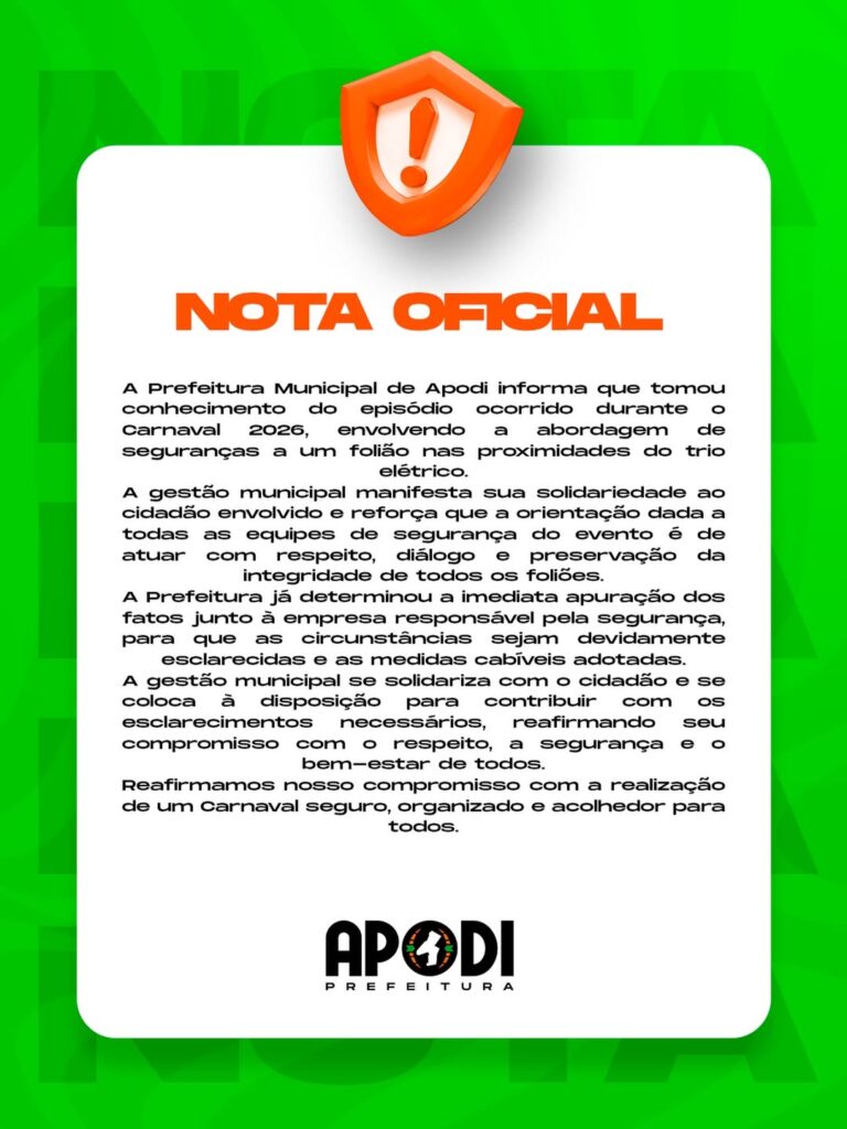 Em nota, a Prefeitura de Apodi afirmou que determinou a imediata apuração dos fatos junto à empresa responsável pela segurança, para que as circunstâncias sejam devidamente esclarecidas e as medidas cabíveis adotadas.