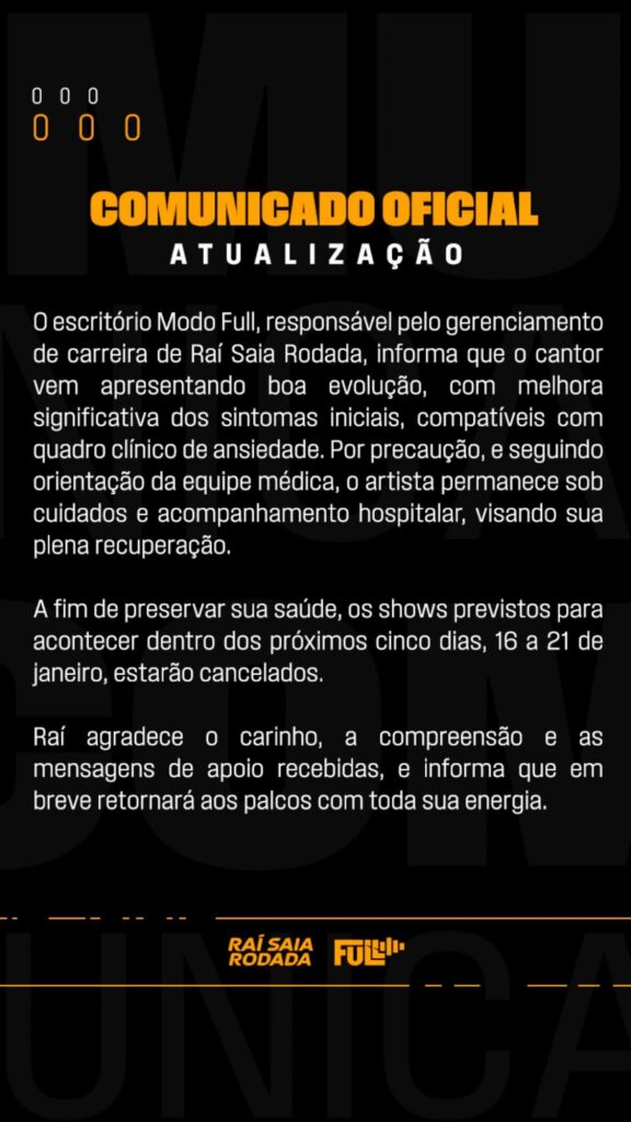A equipe de Raí também informou que os shows previstos para acontecer nos próximos cinco dias, entre 16 e 21 de janeiro, estarão cancelados.