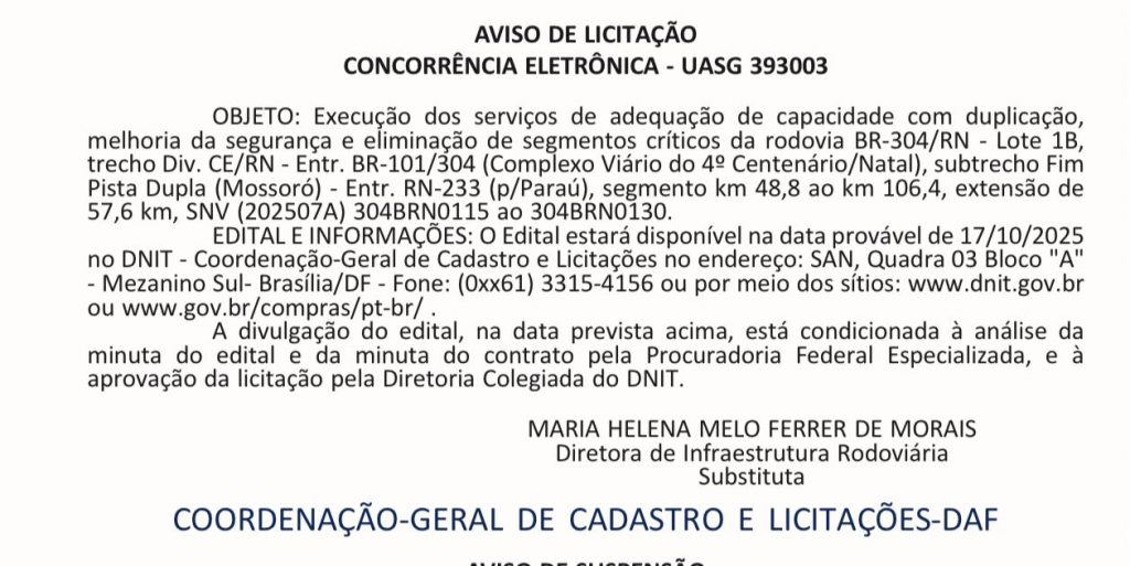 O Departamento Nacional de Infraestrutura de Transportes (DNIT) publicou o aviso de licitação referente ao primeiro lote das obras de duplicação da BR-304. O aviso informa que o edital na íntegra, com o detalhamento para que as empresas participem da concorrência, estará disponível a partir da próxima sexta-feira (17).