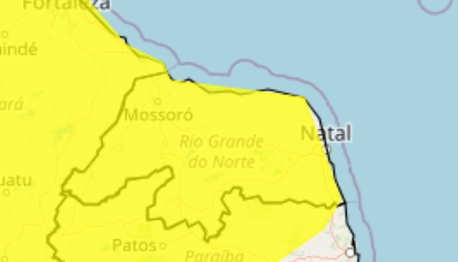 O Instituto Nacional de Meteorologia (Inmet) emitiu um alerta de chuvas intensas para o Rio Grande do Norte, válido para os próximos dias. O aviso começou a valer às 9h24 da última quarta-feira (4) e permanece em vigor até as 10h deste sábado (7).