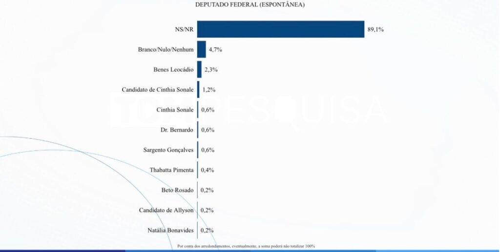 Nos dados, não sabem/não responderam 89,1%. Branco/nulo/nenhum 4,7%. Benes Leocádio aparece com 2,3%. Candidato de Cinthia Sonale tem 1,2%. Cinthia Sonale tem 0,6%. Dr Bernardo aparece com 0,6%. Sargento Gonçalves tem 0,6%. Thabatta Pimenta aparece com 0,4%. Beto Rosado tem 0,2%. Candidato de Allyson aparece com 0,2%.