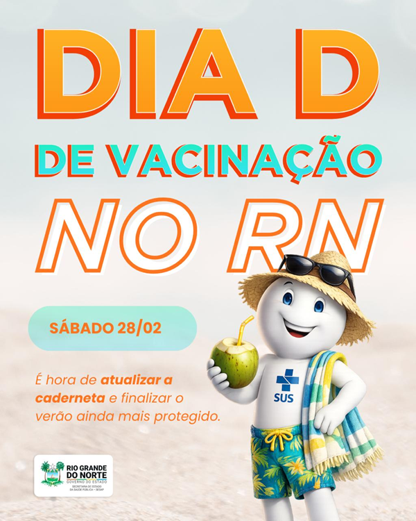 O próximo sábado (28) será de mobilização em todo o Rio Grande do Norte para mais um Dia “D” de Vacinação. A ação integra o Projeto Verão Protegido 2026 e foi recomendada pela Secretaria de Estado da Saúde Pública do Rio Grande do Norte aos municípios como estratégia para atualizar a caderneta vacinal da população.