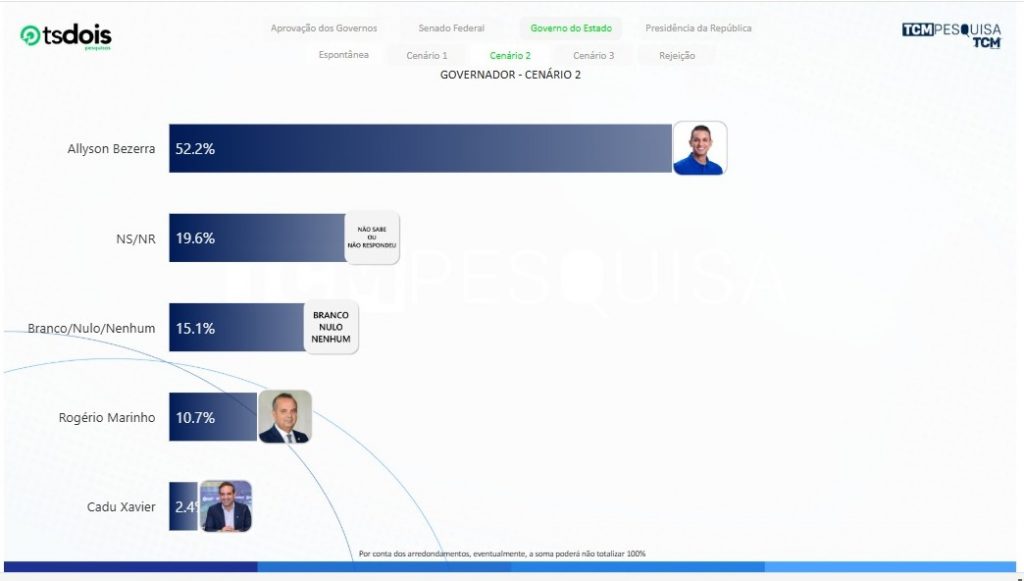 No Cenário 3, Allyson Bezerra aparece com 50,9%, Styvenson Valentim 17,3. Branco/Nulo são 14,7%, não sabem ou não responderam são 14,4% e Cadu Xavier tem 2,7% da intenção de votos para o governo do Estado do RN nas eleições de 2026.