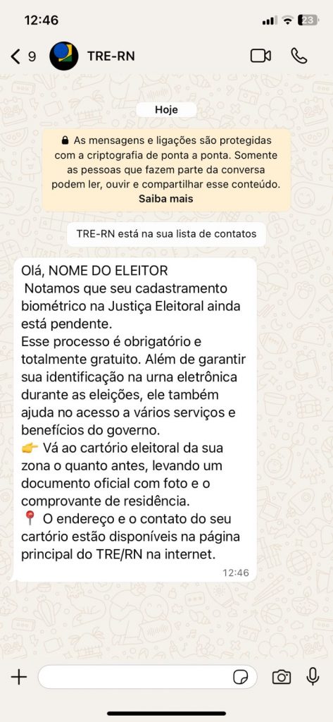 Desde segunda-feira (22), o Tribunal Regional Eleitoral do Rio Grande do Norte (TRE-RN) começou a encaminhar mensagens personalizadas via WhatsApp para os eleitores que ainda não realizaram a coleta de suas digitais. A previsão é que sejam enviadas cerca de 3.600 mensagens por dia, de segunda a sexta-feira, ao longo de dois meses.