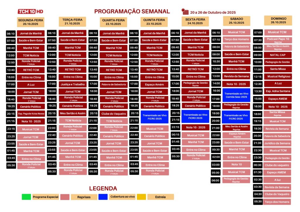 O Canal TCM 10 HD, da TCM Telecom, anunciou sua grade de programação para o período de 13 a 19 de outubro de 2025. A programação poderá ser acompanhada pelos assinantes TCM através dos canais 10 ou 14.1.