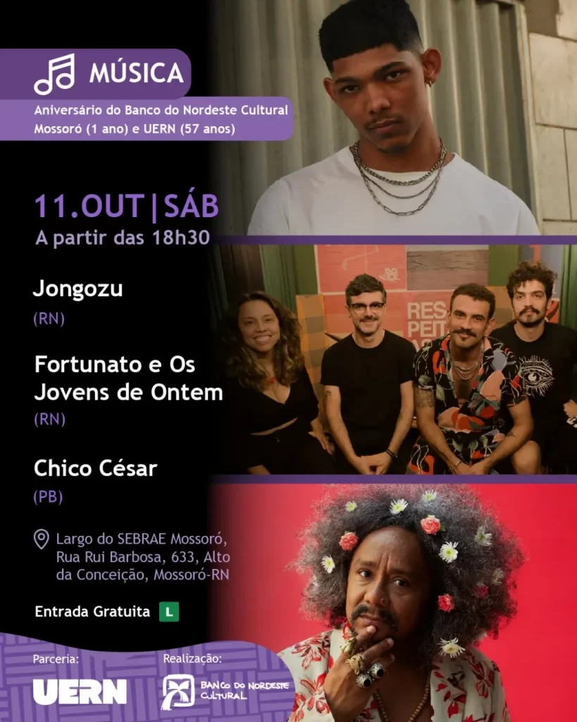 Antes dele, a festa começa com o artista e estudante da UERN Jongozu, às 18h30, trazendo o show “Algoritmo Poético das Ruas”, uma mistura de rap, MPB e poesia urbana. Em seguida, às 19h40, a banda potiguar Fortunato e os Jovens de Ontem apresenta o show “Febre”, com influências do rock e da música latino-americana.