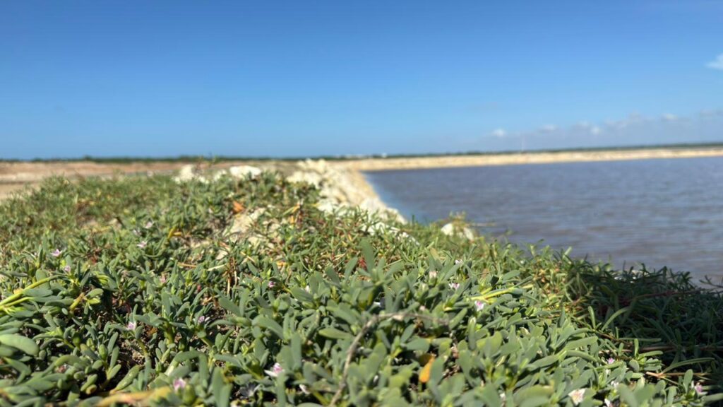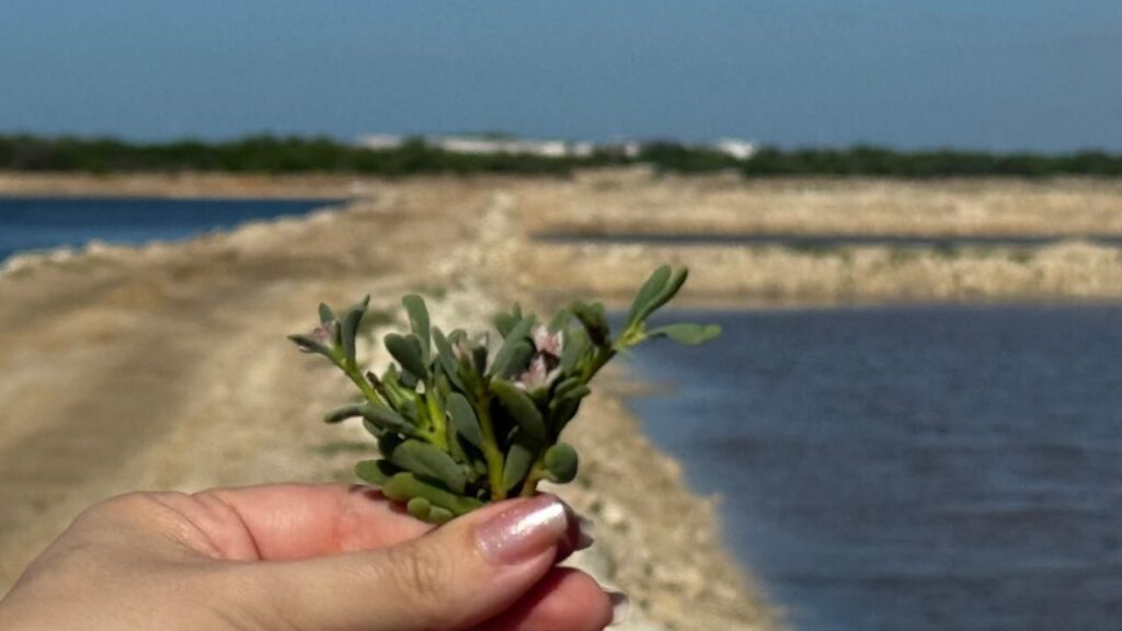 A espécie Sesuvium portulacastrum cresce nos arredores das salinas, ambiente de alta salinidade onde foi realizada a coleta para a pesquisa.