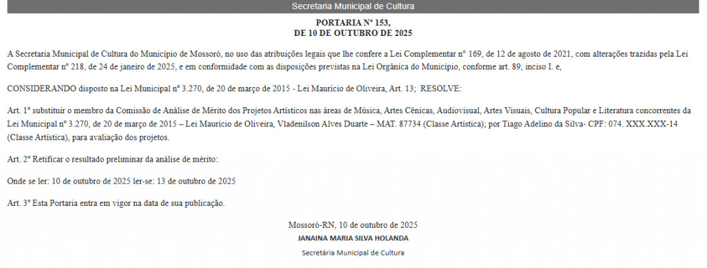 A Prefeitura de Mossoró prorrogou para a próxima segunda-feira (13) a divulgação do resultado preliminar da análise de mérito do Prêmio de Incentivo à Cultura – Lei Maurício de Oliveira. A mudança foi oficializada por meio de portaria publicada nesta sexta-feira (10) no Diário Oficial do Município, alterando o cronograma inicialmente previsto, que marcava a divulgação para o dia 10 de outubro.