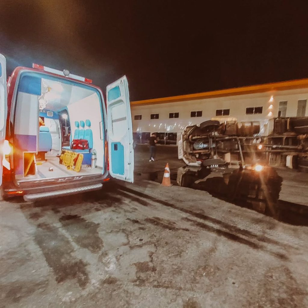 No local, foi constatado o tombamento de uma carreta nas proximidades do Posto Domingos e da Churrascaria Chimarrão. O motorista apresentava suspeita de fratura na clavícula e um corte em um dos membros inferiores.