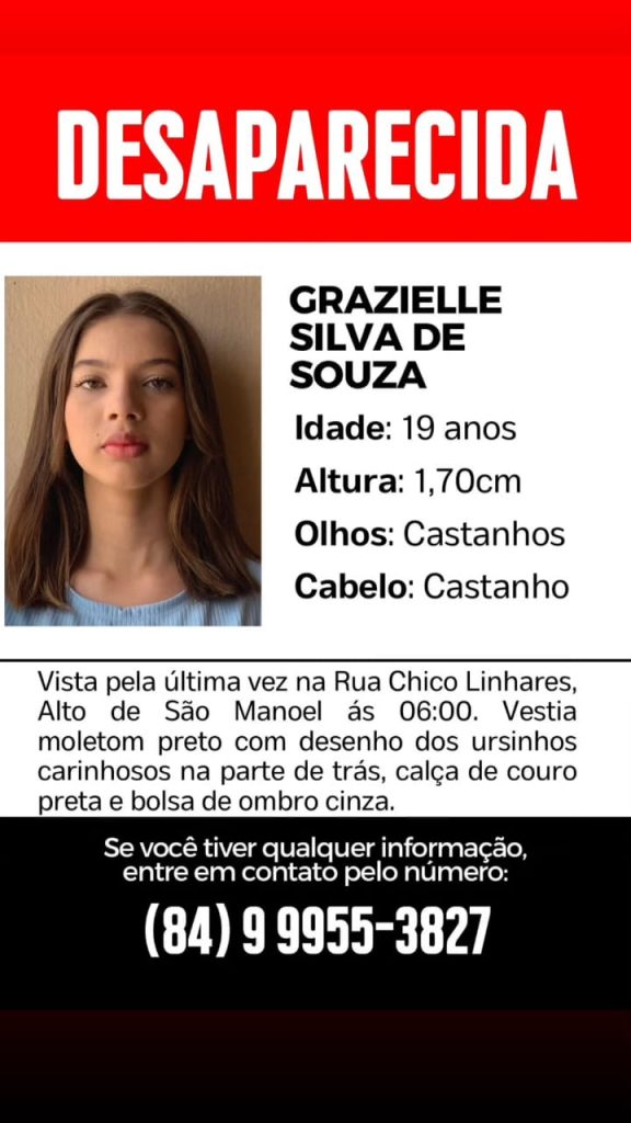 Qualquer informação ou pista que possa levar ao paradeiro da jovem pode ser repassada à família pelo número (84) 9 9955-3827