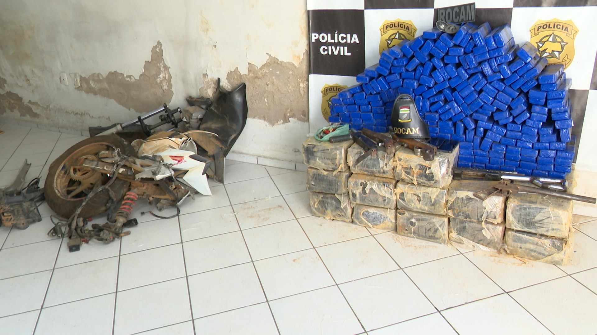 Ao realizar a abordagem, verificaram que o homem estava sujo de terra. Após averiguarem o local, localizaram um buraco onde foram encontrados cerca de 18 pacotes contendo 30 tabletes de maconha. Além do entorpecente, totalizando aproximadamente 270 quilos, foram apreendidas quatro armas de fogo e uma motocicleta roubada.
