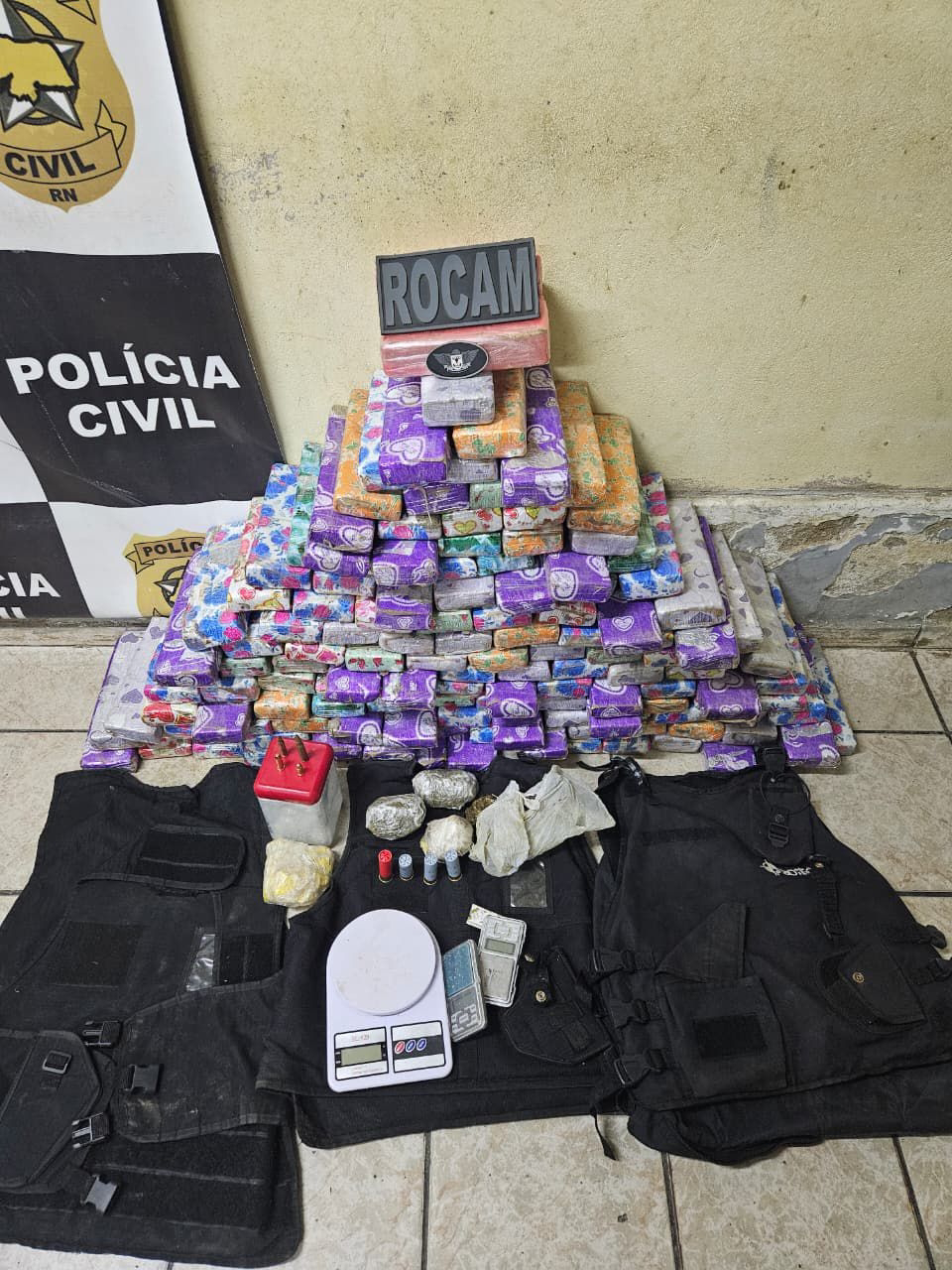 No local, foram apreendidas substâncias entorpecentes em larga escala, sendo 137 tabletes de substância análoga à maconha, 2,3 kg de substância análoga ao crack e 300 g de substância análoga à cocaína, além de três coletes com placas balísticas, munições de calibre 12, de fuzil 7,62 e 5,56, de revólver calibre .38, de pistola calibre .380, bem como balanças de precisão.