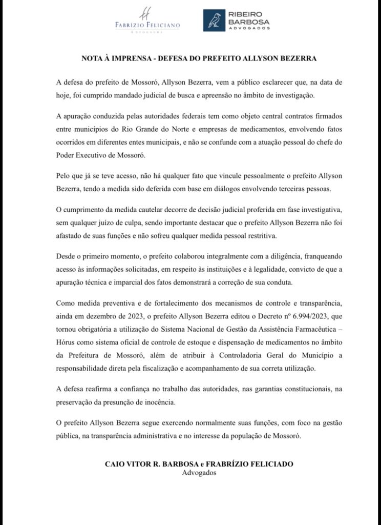 Em nota oficial, a defesa do prefeito Allyson Bezerra informou que foi cumprido mandado judicial de busca e apreensão no âmbito da investigação, mas destacou que a apuração tem como foco contratos firmados entre municípios e empresas de medicamentos, envolvendo diferentes administrações, “não se confundindo com a atuação pessoal do chefe do Executivo de Mossoró”.