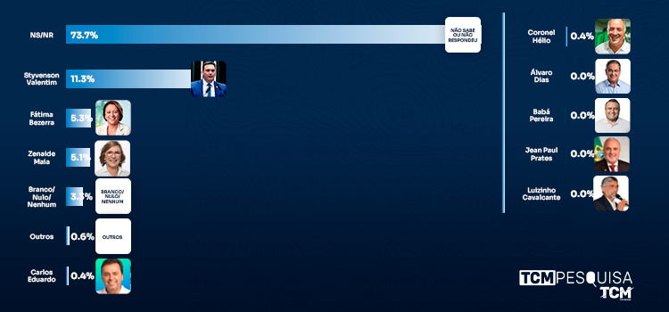 Na pesquisa espontânea, não souberam ou não responderam 73,7% dos entrevistados. Styvenson Valentim aparece com 11,3%, Fátima Bezerra aparece com 5,3%, Zenaide Maia com 5,1%, branco/nulo/nenhum 3,3%, outros com 0,6%. Carlos Eduardo e Coronel Hélio tem ambos 0,4. Álvaro Dias, Babá Pereira, Jean Paul Prates e Luizinho Cavalcante não pontuaram.