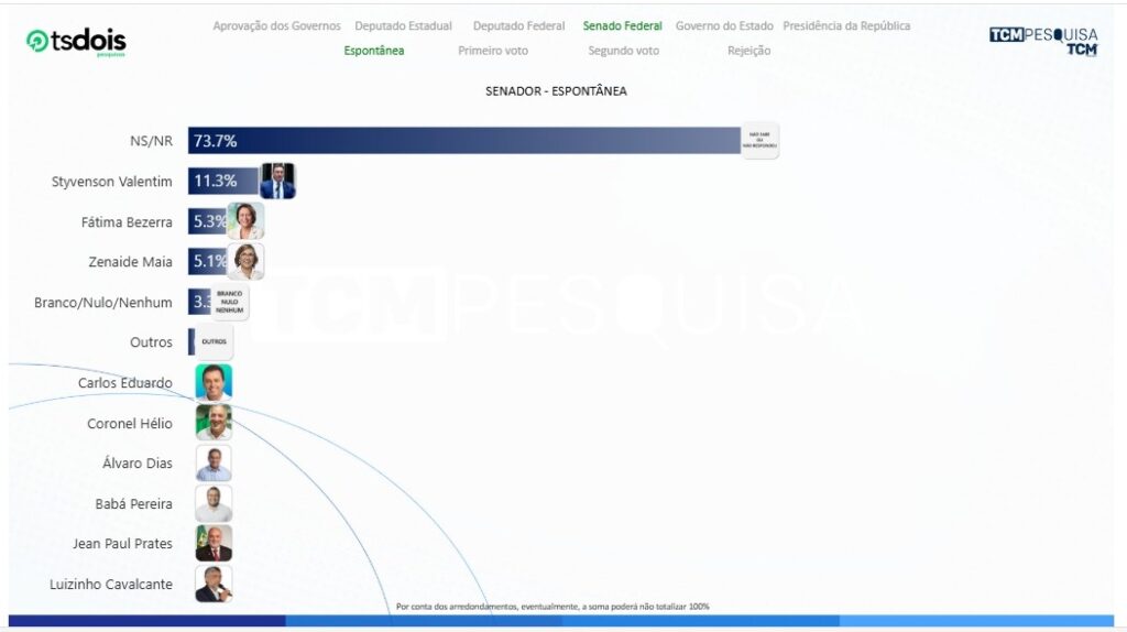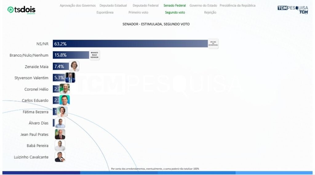 A Pesquisa TCM/TSDois traz, nesta segunda-feira (22), mais um levantamento de 2025 com a intenção de votos para o Senado Federal em Grossos.