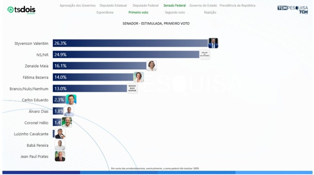 Na pesquisa estimulada, quando considerado o primeiro voto, Styvenson Valentim aparece com 26,3%, não souberam ou não responderam 24,9%, Zenaide Maia aparece com 16,1%, Fátima Bezerra tem 14,0%, branco/nulo/nenhum 13,0%. Carlos Eduardo tem 2,3%, Álvaro Dias tem 1,8%, Coronel Hélio 1,4%, Luizinho Cavalcante com 0,2%, Babá Pereira e Jean Paul Prates com 0,0%.