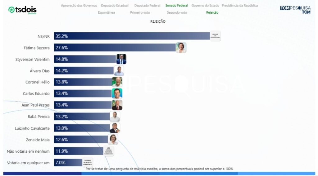 No quesito rejeição não souberam ou não responderam 35,2%, Fátima Bezerra aparece com 27,6%, Styvenson Valentim com 14,8%, Álvaro Dias com 14,2%, Coronel Hélio com 13,8%, Carlos Eduardo e Jean Paul Prates ambos com 13,4%, Babá Pereira 13,2%, Luizinho Cavalcante com 13,0%, Zenaide Maia com 12,6%, não votaria em nenhum 11,9%, votaria em qualquer um 7,0%.