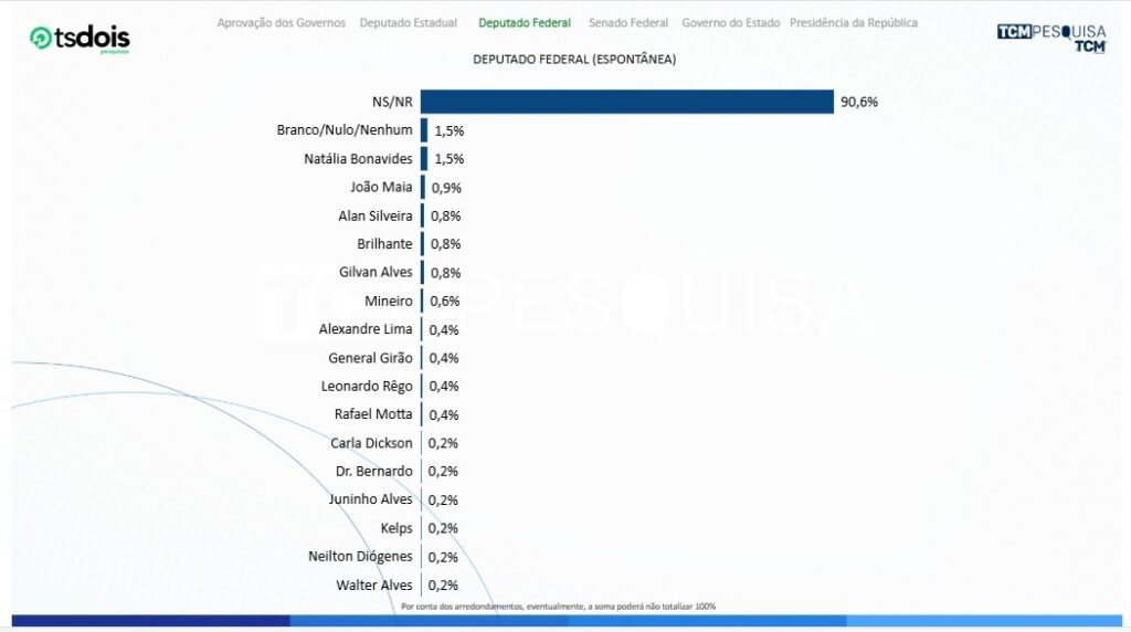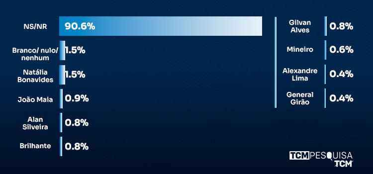 Nos dados, não sabem/não responderam 90,6%. Branco/nulo/nenhum 1,5%. Natália Bonavides tem 1,5%. João Maia 0,9%. Alan Silveira, Brilhante e Gilvan Alves aparecem com 0,8%. Mineiro tem 0,6%. Alexandre Lima, General Girão, Leonardo Rêgo e Rafael Motta aparecem com 0,4%. Carla Dickson, Dr. Bernardo, Juninho Alves, Kelps, Neilton Diógenes e Walter Alves aparecem com 0,2%.
